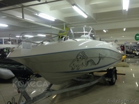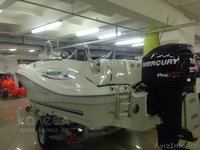 Центральная консоль с сиденьем рулевого, откидная лестница, вместительный рундук, каюта с биотуалетом, спидометр, тахометр, индикатор уровня топлива, индикатор положения мотора, топливный бак 135л.