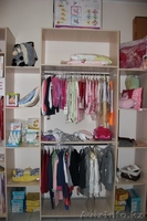 Размеры стенда для одежды: высота 233 см., длина 360 см., глубина 40 см. - 3 отсека со штангами для одежды, наверху дополнительно полки, а так же 8 полочек-перегородок.